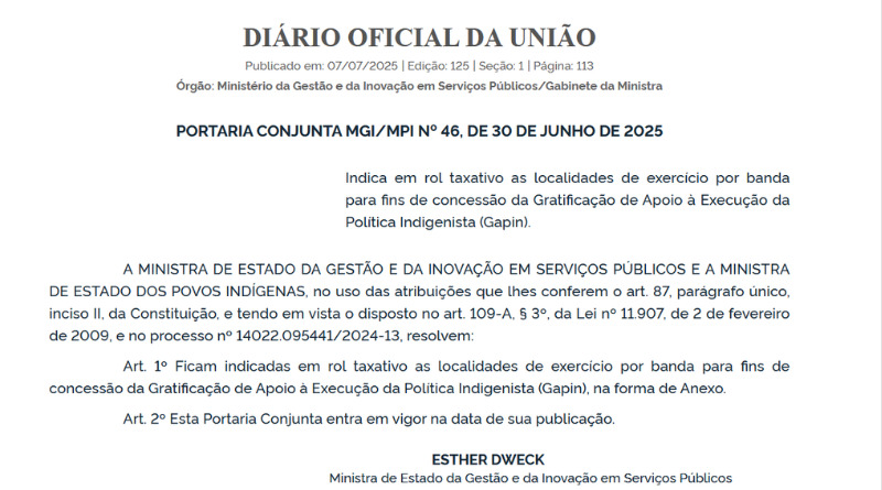 Após pressão do Sindsep-DF e da Condsef, que encaminharam ofícios cobrando a regulamentação das bandas da Gapin, os Ministérios da Gestão e da Inovação em Serviços Públicos (MGI) e dos Povos Indígenas (MPI) publicaram no Diário Oficial da União (DOU) desta segunda-feira, 7, a Portaria Conjunta nº 46, de 30 de junho de 2025, que indica as localidades de exercício por banda para fins de concessão da Gratificação de Apoio à Execução da Política Indigenista (Gapin) aos servidores da Fundação Nacional dos Povos Indígenas (Funai).