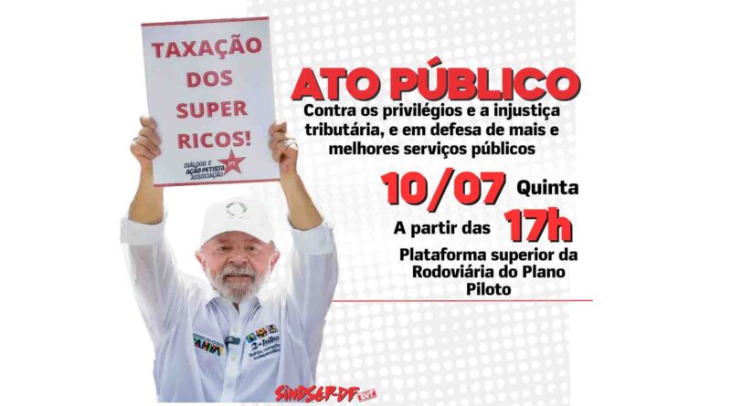 O Sindsep-DF convoca todos os servidores de sua base para participarem de ato público nesta quinta-feira, dia 10, a partir das 17h, na plataforma superior da Rodoviária do Plano Piloto, contra os privilégios e a injustiça tributária, e em defesa de mais e melhores serviços públicos.