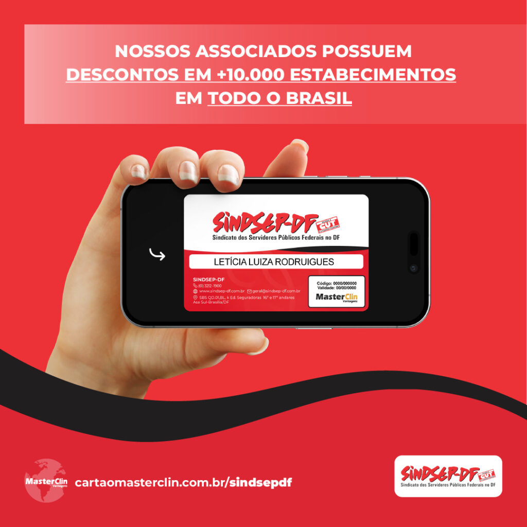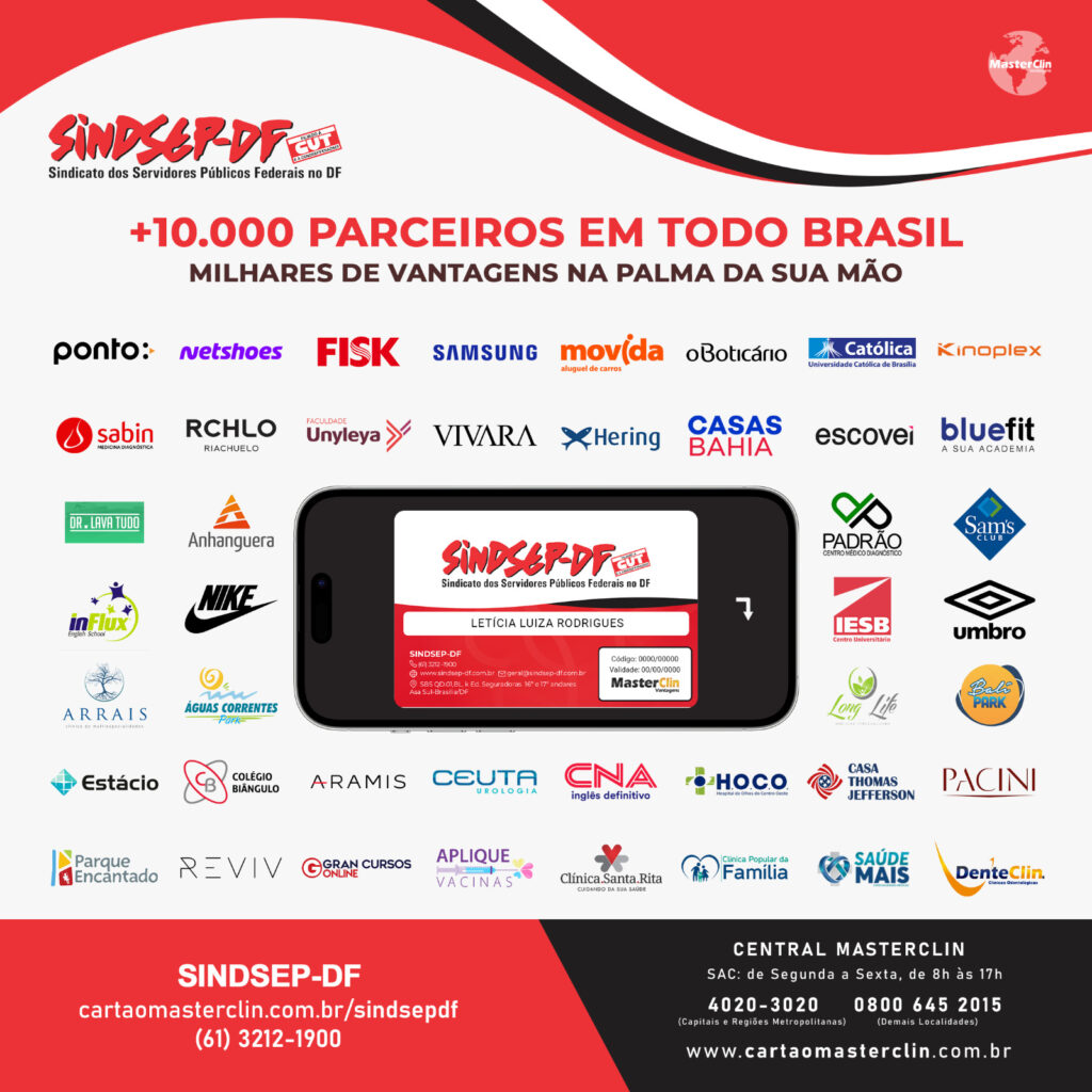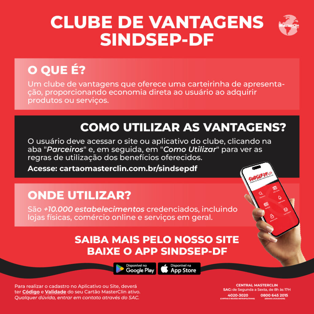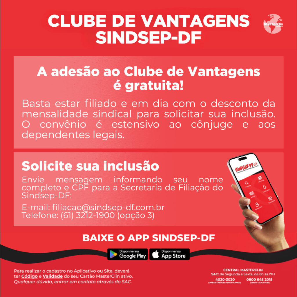 Mas ATENÇÃO: Para usufruir do Clube de Vantagens, é necessário estar filiado ao Sindsep-DF e com a contribuição sindical em dia. A solicitação de inclusão no MasterClin deve ser feita junto à Secretaria de Filiação. O convênio é totalmente gratuito para os filiados e também pode ser estendido ao cônjuge e aos dependentes legais, mediante apresentação de documentação comprobatória ao sindicato.