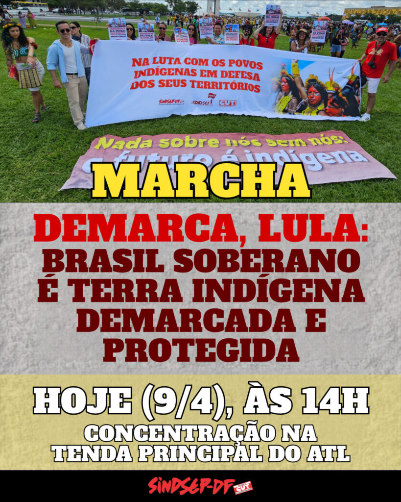 O Sindsep-DF convoca toda a sua base para, em solidariedade de classe, integrar a marcha dos povos indígenas “Demarca, Lula: Brasil soberano é terra indígena demarcada e protegida”, nesta quinta-feira (9), com saída às 14h, do Acampamento Terra Livre (ATL), no espaço localizado no Eixo Cultural Ibero-Americano (antiga Funarte).