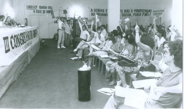 Em 1991, a Companhia Brasileira de Alimentos (Cobal), Companhia de Financiamento da Produção (CFP) e a Companhia Brasileira de Armazenamento (Cibrazem) foram unificadas para formar a Conab – Companhia Nacional de Abastecimento; os empregados das três empresas, que já participavam intensamente da luta pela democratização do país e em defesa do sindicalismo livre da tutela estatal, foram um dos principais pontos de apoio da construção do Sindsep-DF. A foto é do III Congresso do Sindsep-DF. Os empregados da Conab lutam em defesa da empresa. Na faixa pode-se ler: “A Conab é do povo. Não à privatização, ao pagamento da dívida. Fora FMI!”