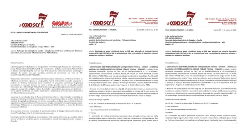Em ofício conjunto (disponível aqui), a Condsef e o Sindsep-DF cobram reunião urgente com a Secretaria de Relações do Trabalho do Ministério da Gestão e da Inovação em Serviços Públicos (SRT/MGI) para tratar de demandas específicas de servidores com deficiência e de responsáveis por pessoas com deficiência (PCDs).