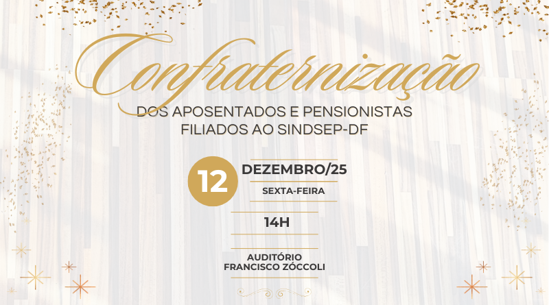 O Sindsep-DF convida todos os aposentados e pensionistas filiados ao sindicato para confraternizar no dia 12 de dezembro, sexta-feira, no auditório Francisco Zóccoli (SBS, Qd. 1, bloco K, Ed. Seguradoras, 17º andar), a partir das 14h.