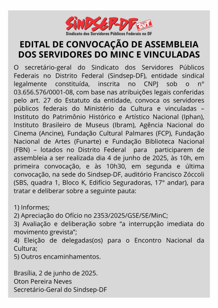 O secretário-geral do Sindicato dos Servidores Públicos Federais no Distrito Federal (Sindsep-DF), entidade sindical legalmente constituída, inscrita no CNPJ sob o n° 03.656.576/0001-08, com base nas atribuições legais conferidas pelo art. 27 do Estatuto da entidade, convoca os servidores públicos federais do Ministério da Cultura e vinculadas – Instituto do Patrimônio Histórico e Artístico Nacional (Iphan), Instituto Brasileiro de Museus (Ibram), Agência Nacional do Cinema (Ancine), Fundação Cultural Palmares (FCP), Fundação Nacional de Artes (Funarte) e Fundação Biblioteca Nacional (FBN) – lotados no Distrito Federal para participarem de assembleia a ser realizada dia 4 de junho de 2025, às 10h, em primeira convocação, e às 10h30, em segunda e última convocação, na sede do Sindsep-DF, auditório Francisco Zóccoli (SBS, quadra 1, Bloco K, Edifício Seguradoras, 17° andar), para tratar e deliberar sobre a seguinte pauta:
