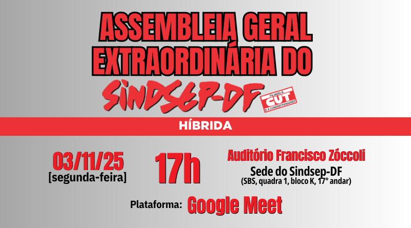 O secretário-geral do Sindicato dos Servidores Públicos Federais no Distrito Federal (Sindsep-DF), entidade sindical legalmente constituída, inscrita no CNPJ sob o n° 03.656.576/0001-08, com base nas atribuições legais conferidas pelo art. 27 do Estatuto da entidade, convoca os servidores públicos federais, para participarem de assembleia geral extraordinária do Sindsep-DF a ser realizada dia 03 de novembro de 2025, 16h30, em primeira convocação, e às 17h, em segunda e última convocação, de forma híbrida, no auditório Francisco Zóccoli, sede do Sindsep-DF (SBS, Quadra 1, Bloco K, Ed. Seguradoras, 17º andar), e via videoconferência por meio de sala de reunião virtual do Google Meet, para discutir e deliberar sobre a seguinte pauta: