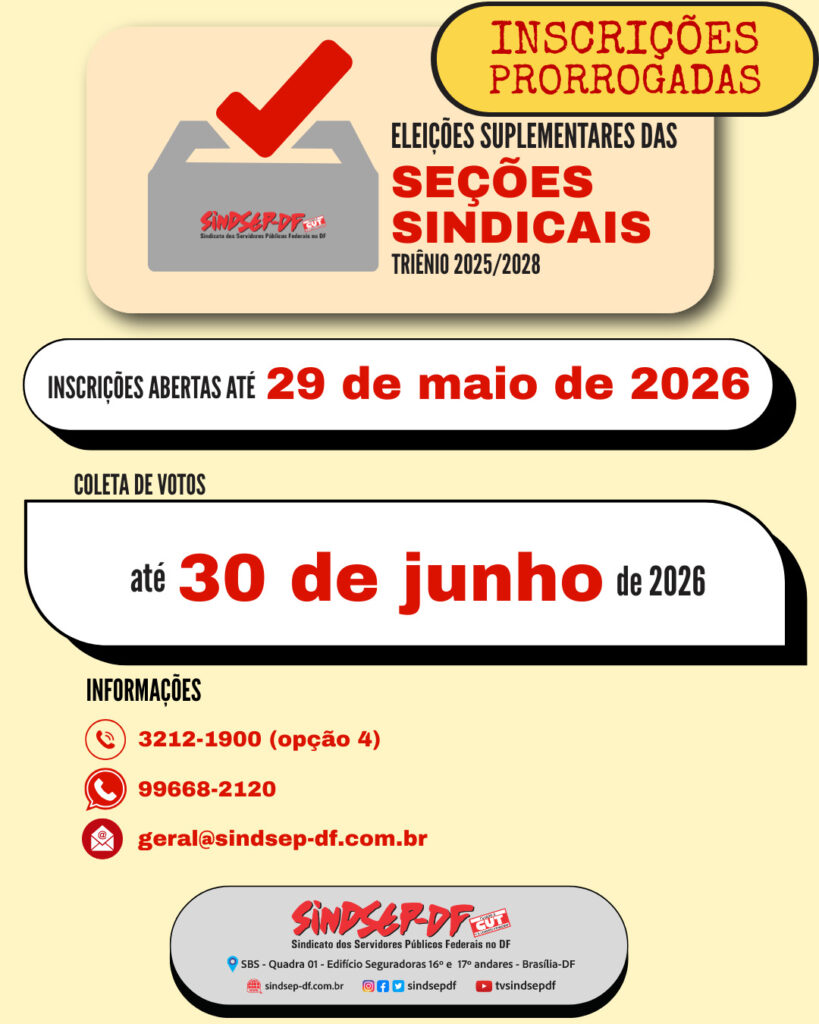 Estão prorrogadas as inscrições para as chapas que desejam concorrer às eleições suplementares das Seções Sindicais do Sindsep-DF para o mandato 2025/2028. O prazo segue aberto até o dia 29 de maio, das 8h às 18h, conforme edital publicado no site do sindicato no dia 13 de abril. As inscrições devem ser feitas na Secretaria-Geral do Sindsep-DF, na sede do sindicato (Setor Bancário Sul, Quadra 1, Bloco K, Edifício Seguradoras, 16° andar). Apenas servidores federais filiados ao sindicato podem concorrer ao pleito.