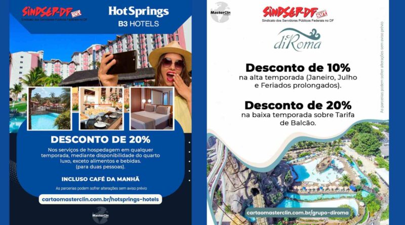 Os servidores filiados ao Sindsep-DF têm descontos imperdíveis na hospedagem nos hotéis HotSprings e DiRoma, ambos em Caldas Novas. Para usufruir do benefício, basta estar filiado e em dia com a mensalidade sindical e solicitar à Secretaria de Filiação sua inclusão no MasterClin Vantagens, clube de benefícios com mais de 10 mil estabelecimentos parceiros em todo o país.