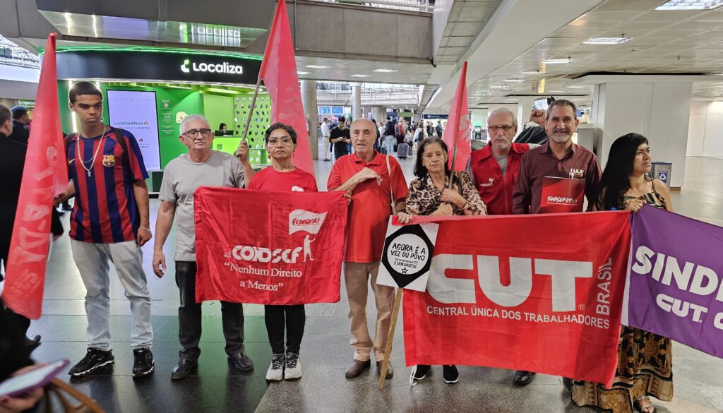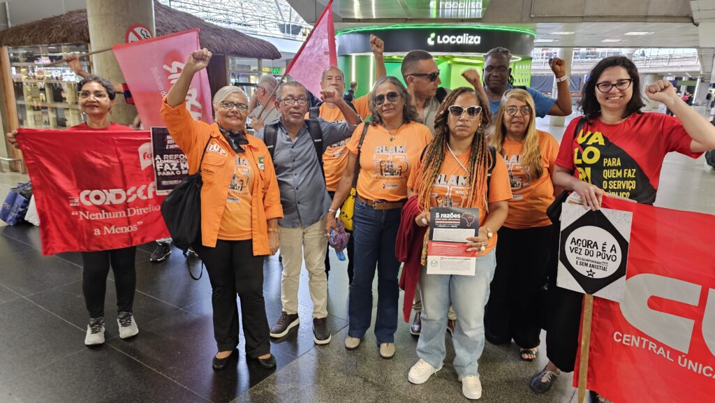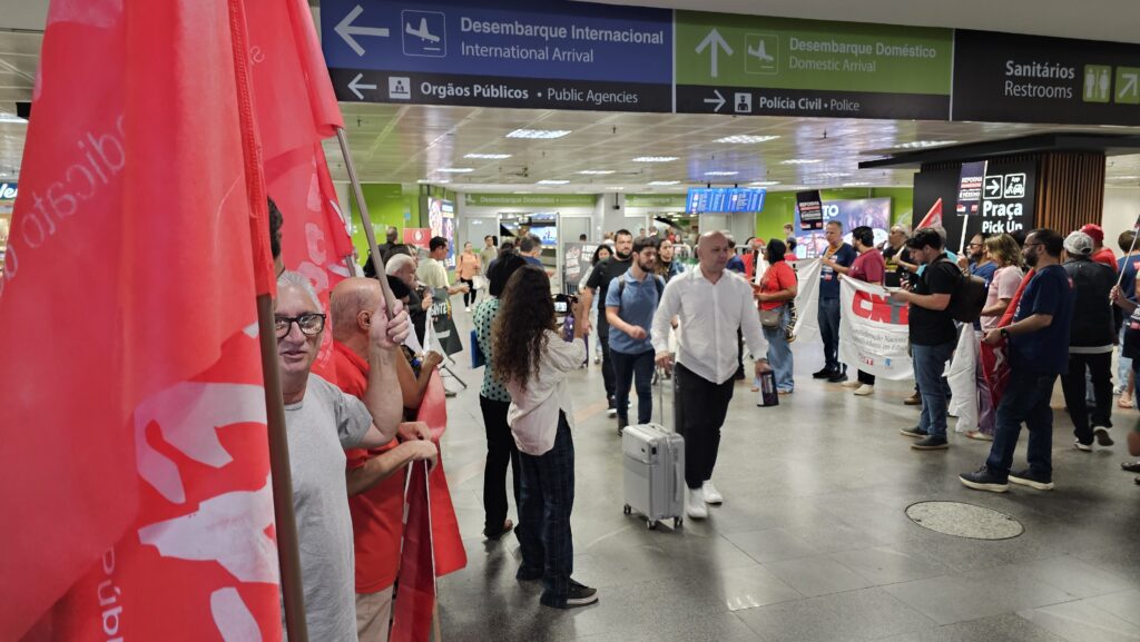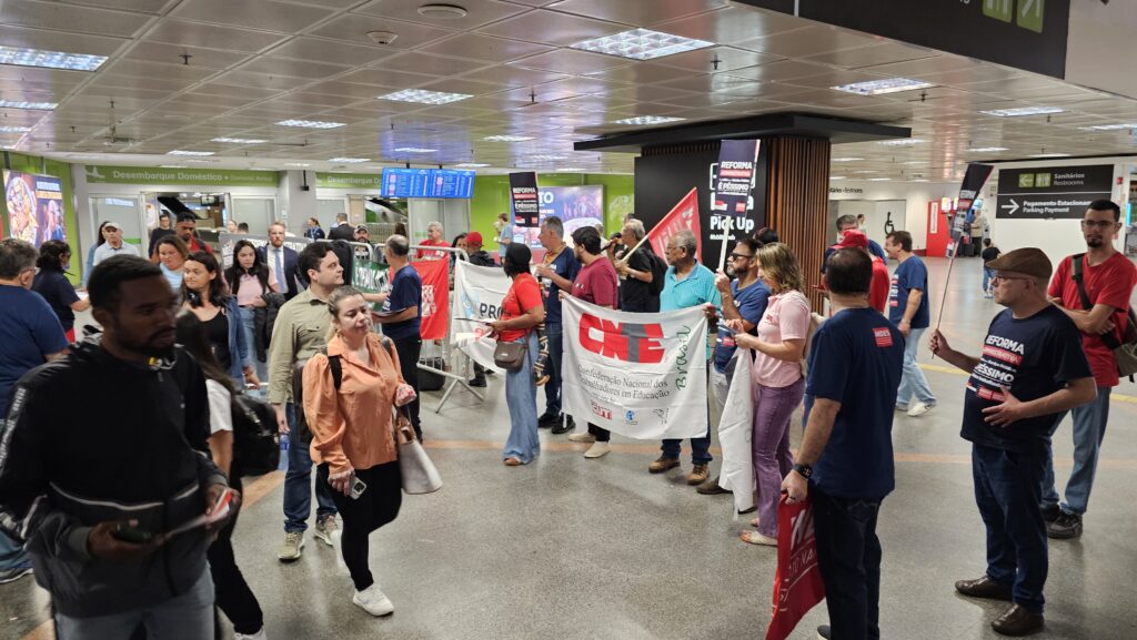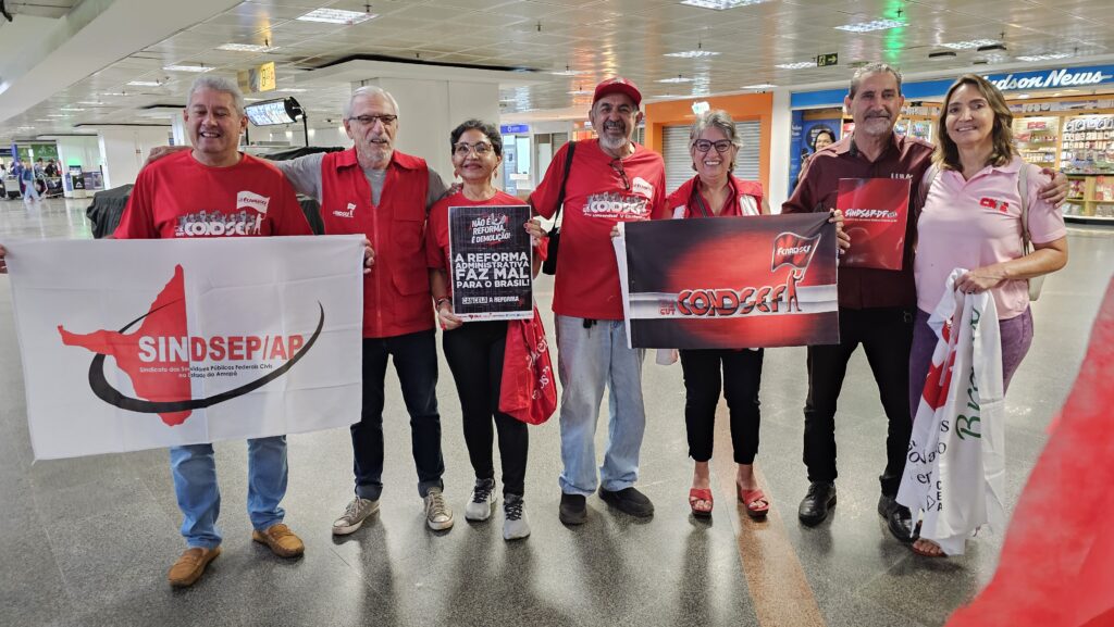 Concentrados em frente ao portão de desembarque dos voos nacionais, os sindicalistas destacaram em suas falas os riscos da reforma administrativa em curso na Câmara dos Deputados para todo o povo brasileiro, especialmente para aqueles que dependem de políticas públicas sociais. O texto elaborado no Grupo de Trabalho (GT) propõe cortes e flexibilizações que enfraquecem a máquina pública e impõem retrocessos significativos ao povo brasileiro, para atender aos interesses de setores financeiros e empresariais e transformar o Estado em um balcão de negócios.