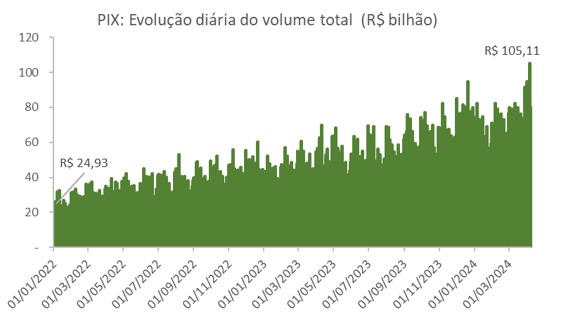 O volume diário total ultrapassou R$ 100 bilhões em abril/2024, enquanto o volume trimestral atingiu 155% do PIB no último trimestre de 2023.