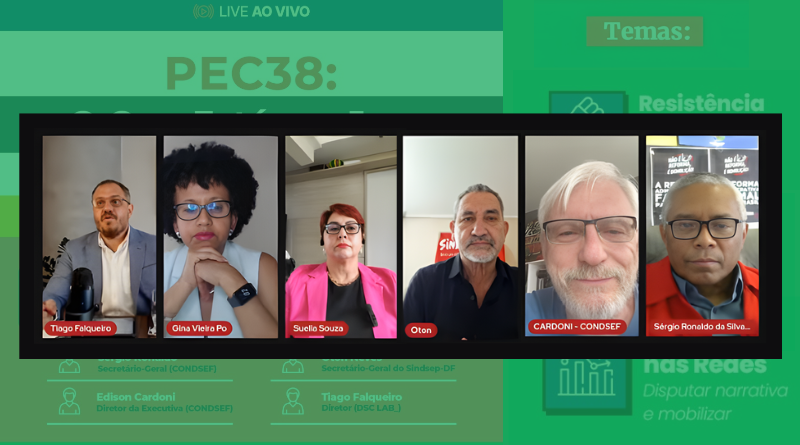A CONDSEF (Confederação Nacional dos Servidores Públicos Federais) e o SINDSEP-DF (Sindicato dos Servidores Públicos Federais no DF) realizaram nesta terça-feira (16) transmissão ao vivo sobre a PEC 38/2025 (Reforma Administrativa), reunindo parlamentares, especialistas em comunicação, lideranças sindicais e pesquisador de redes sociais para debater os impactos da proposta e as estratégias de mobilização contra sua aprovação.