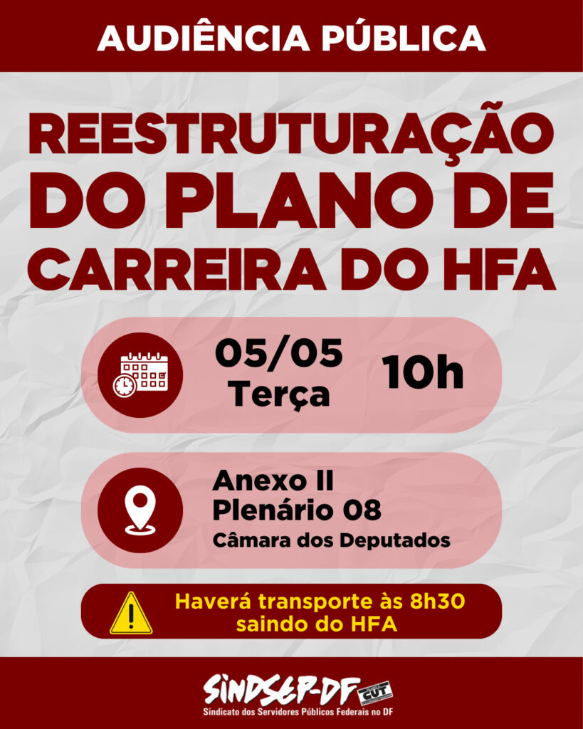 Em reunião virtual com a direção do Sindsep-DF na terça-feira (28), os servidores do Hospital das Forças Armadas (HFA) discutiram a organização da categoria para participação na audiência pública que debaterá a reestruturação do Plano de Carreira do órgão. A atividade será realizada na próxima terça-feira, 5 de maio, às 10h, no Plenário 08 do Anexo II da Câmara dos Deputados. Convocada pela Comissão de Administração e Serviço Público (CASP), por solicitação do deputado federal Reginaldo Veras (PV-DF), a audiência deverá contar, além da representação do Sindsep-DF, com a participação de representantes do HFA e do Ministério da Gestão e da Inovação em Serviços Públicos (MGI). Para viabilizar maior participação dos servidores na audiência, o sindicato disponibilizará transporte no dia 5, com saída do HFA às 8h30.