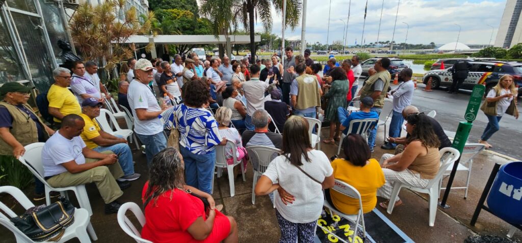 Servidores do Ministério da Saúde exigem reestruturação e reajustes em ato diante da sede da pasta