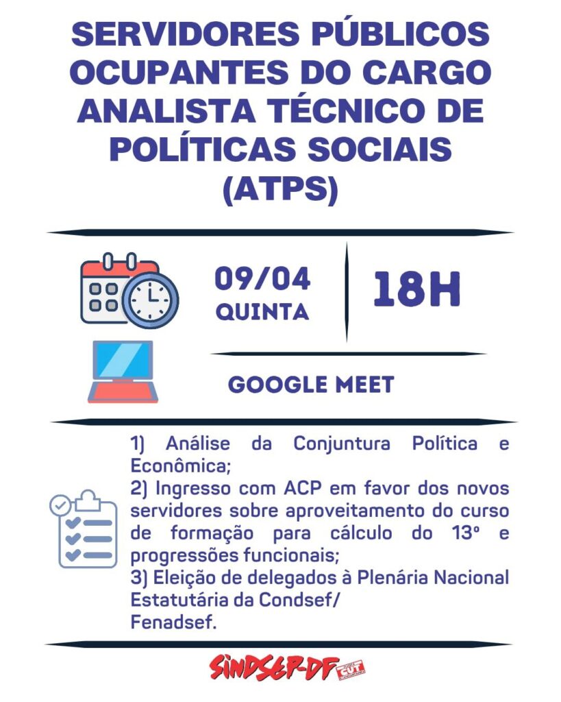 Para informes e deliberação sobre a Ação Civil Pública e a eleição de delegados à Plenária Estatutária da Condsef/Fenadsef, o Sindsep-DF realiza assembleia dos servidores ATPS na próxima quinta-feira, dia 9, às 18h, pela plataforma Google Meet.