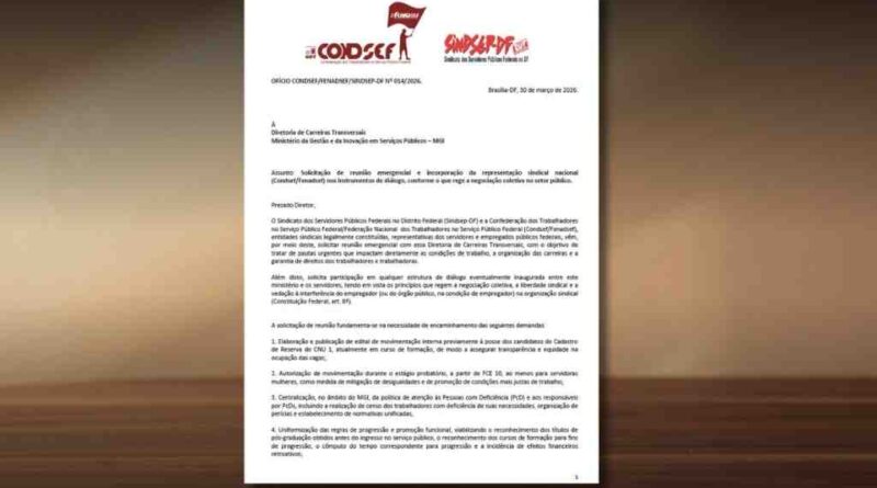 No documento, Sindsep-DF e Condsef também solicitam a realização de reunião emergencial para tratar de pautas urgentes que impactam diretamente as condições de trabalho, a organização das carreiras e a garantia de direitos dos trabalhadores do setor público.