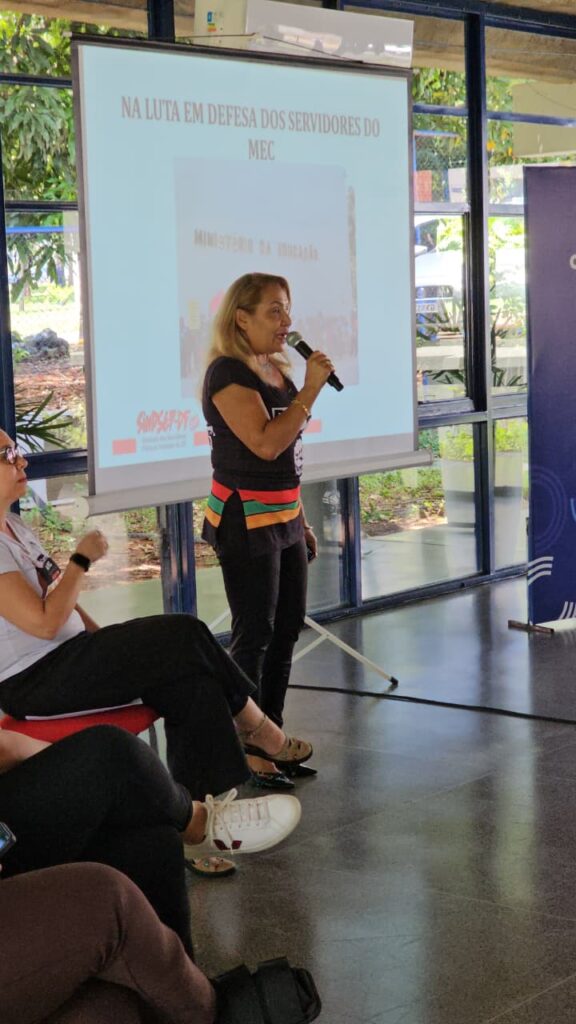 Participaram da atividade as diretoras do Sindsep-DF Marta Rosângela Ferreira Alves Pereira e Inês Regina Mores de Souza, que também integra o Departamento de Educação e Cultura (DEC) da Condsef, e as delegadas sindicais Beronicy Paula de Morais Farias e Patrícia Calazans Oliveira. As dirigentes sindicais alertaram para os riscos representados pela PEC 3Oitão, em tramitação na Câmara dos Deputados. Com viés liberal, fiscalista e punitivista, a proposta atende a interesses do mercado financeiro, enfraquece o Estado, desmonta garantias constitucionais e aprofunda a precarização de serviços essenciais, como saúde, educação e segurança pública, entre outros.