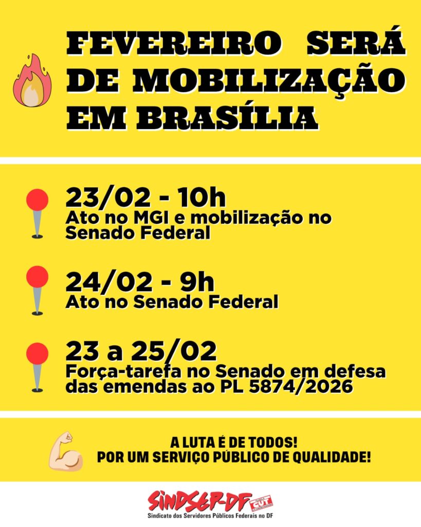 A primeira grande mobilização acontece na segunda-feira, dia 23 de fevereiro, com ato a partir das 10h, em frente ao Ministério da Gestão e da Inovação em Serviços Públicos (MGI), no Bloco C.