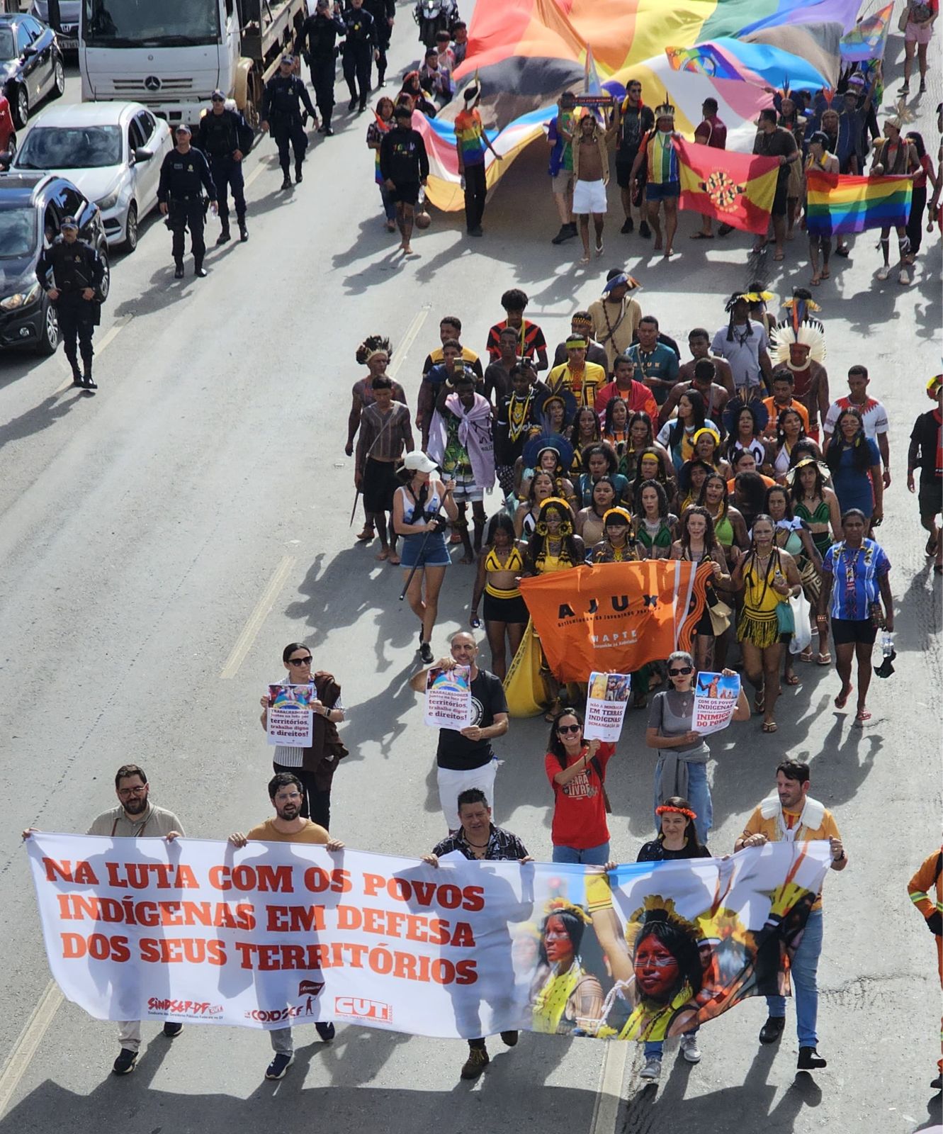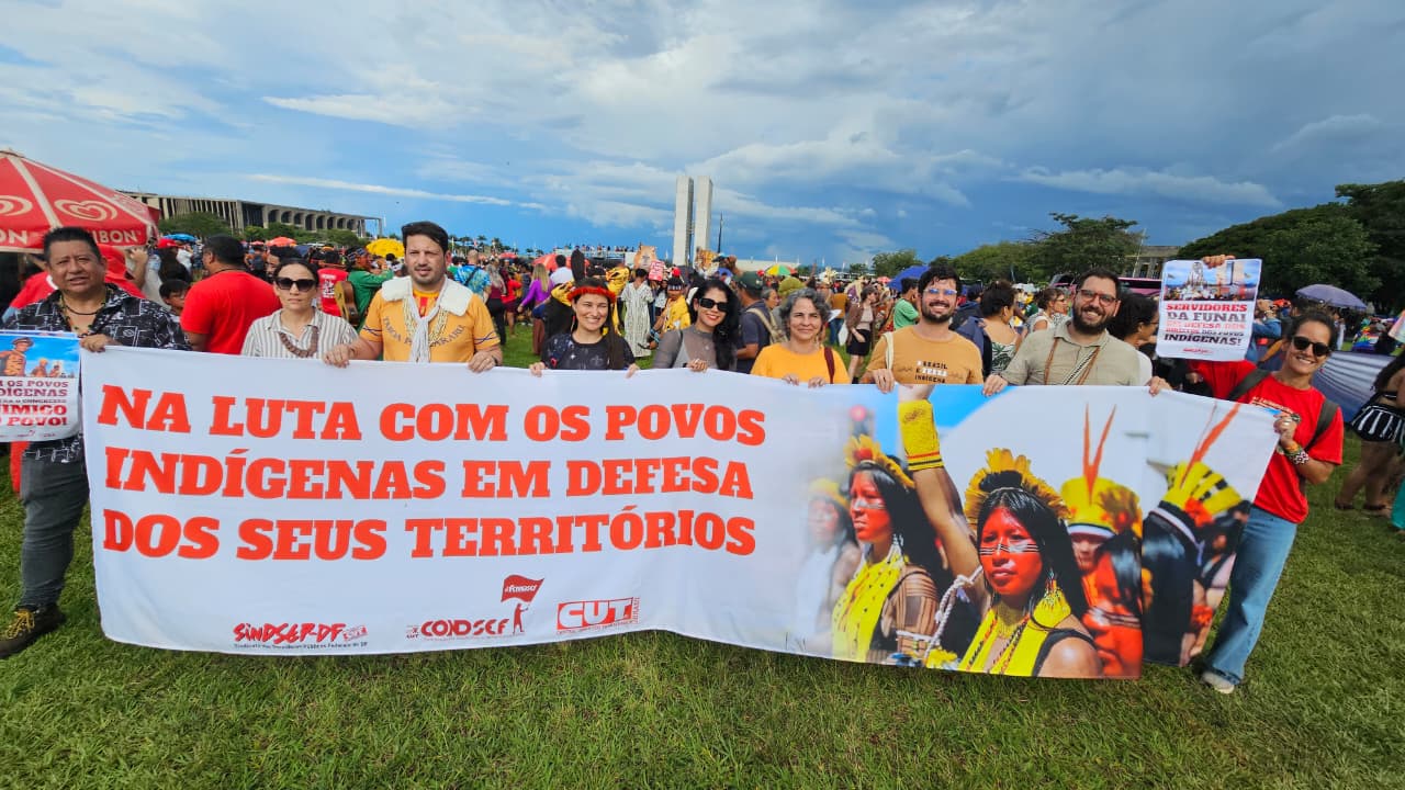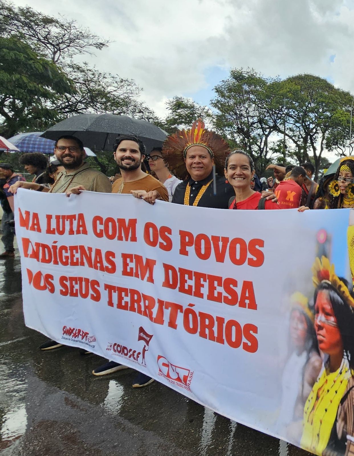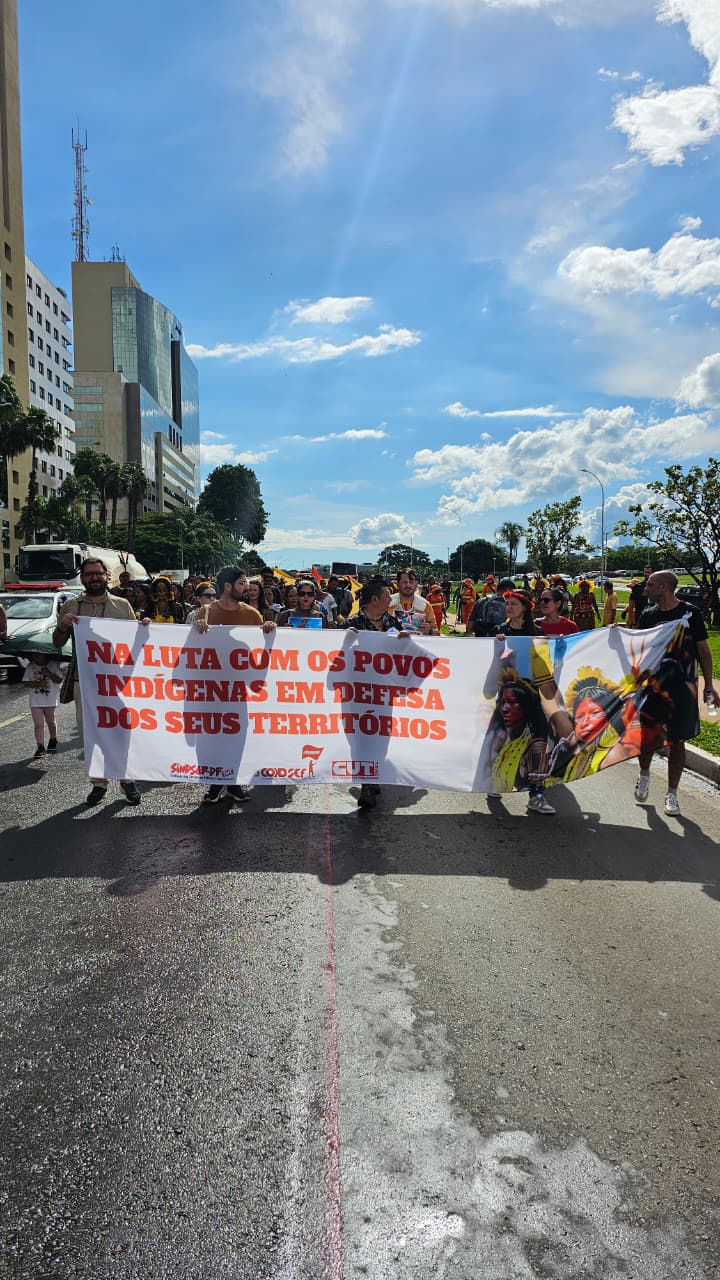 A direção do Sindsep-DF participou na tarde desta quinta-feira, 9 de abril, da marcha dos povos indígenas “Demarca, Lula: Brasil soberano é terra indígena demarcada e protegida”. Com faixas e cartazes, o sindicato reafirmou seu compromisso em defesa da demarcação e proteção dos territórios e dos direitos dos povos indígenas, fundamentais para garantir as condições de reprodução da vida de toda a sociedade e que, por isso, constituem uma luta de toda a classe trabalhadora.