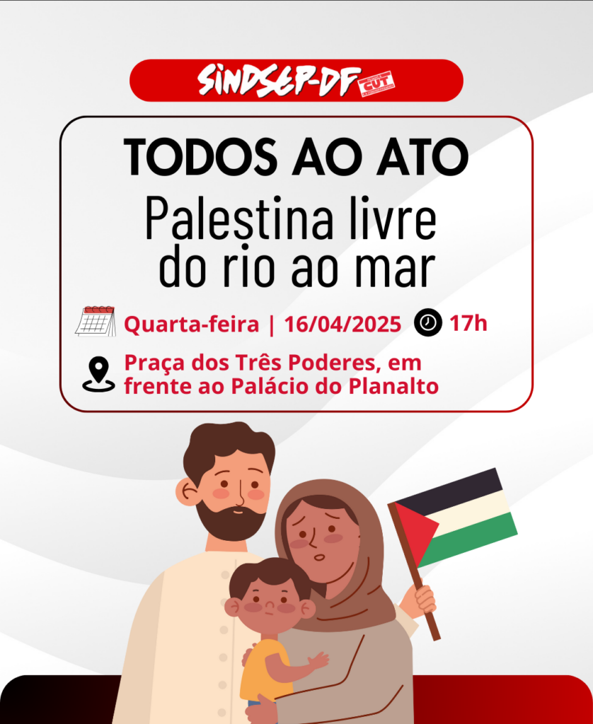 O Sindsep-DF estará presente com sua direção para manifestar solidariedade ao povo palestino e para unir sua voz a de milhares de organizações e militantes que, ao redor do mundo, exigem o fim do genocídio. Participe você também!